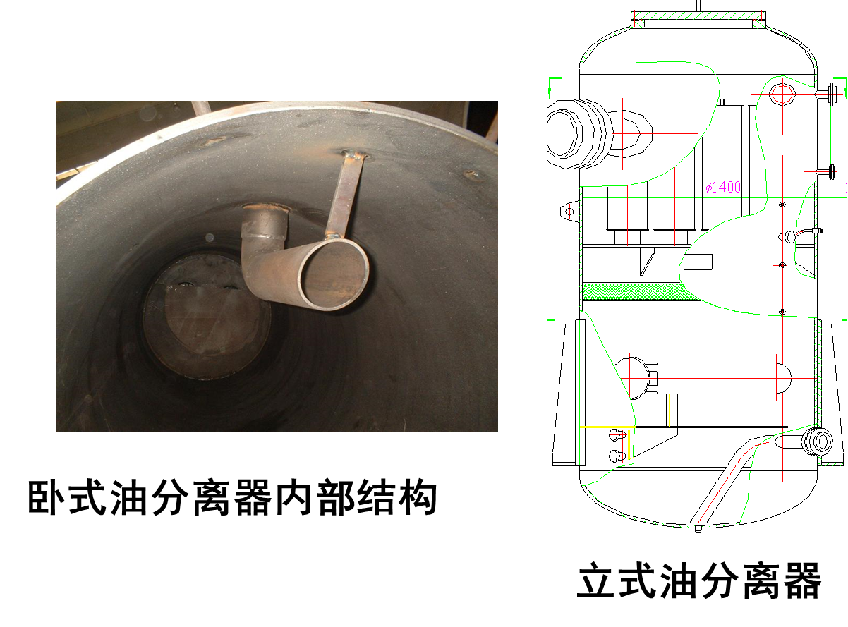 2、卧式结构,压缩机所排出的高压气体经排气管转向,进入油分空间后进行减速、反向,分离出大部分润滑油,这是第一次分离;制冷剂气体经过筒体流向高效油分滤芯时,润滑油微粒与筒壁吸附及重力沉降,完成第二次分离;制冷剂气体进入高效油分滤芯,经吸附、凝聚除去其余的油,这是第三次分离。分离出润滑油的洁净制冷剂最后排出油分离器进入冷凝器,而分离出的润滑油进入油冷却器。