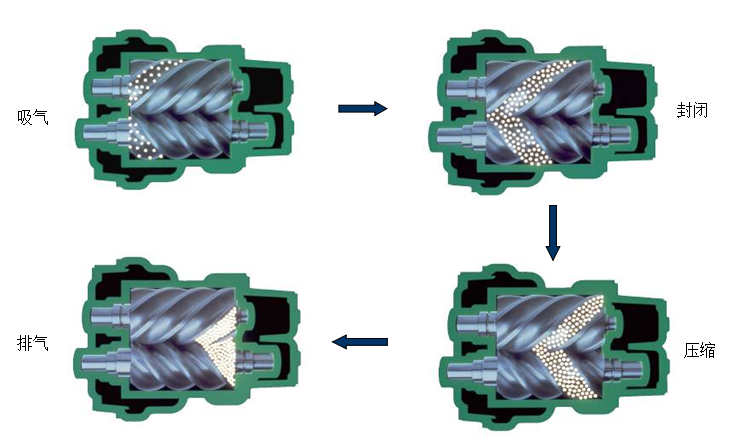 螺杆式制冷压缩机的运转过程从吸气过程开始,然后气体在密封的基元容积中被压缩,最后由排气孔口排出。阴、阳转子和机体之间形成的呈"V"字型的一对齿间容积(基元容积)的大小,随转子的旋转而变化,同时,其空间位置也不断移动。