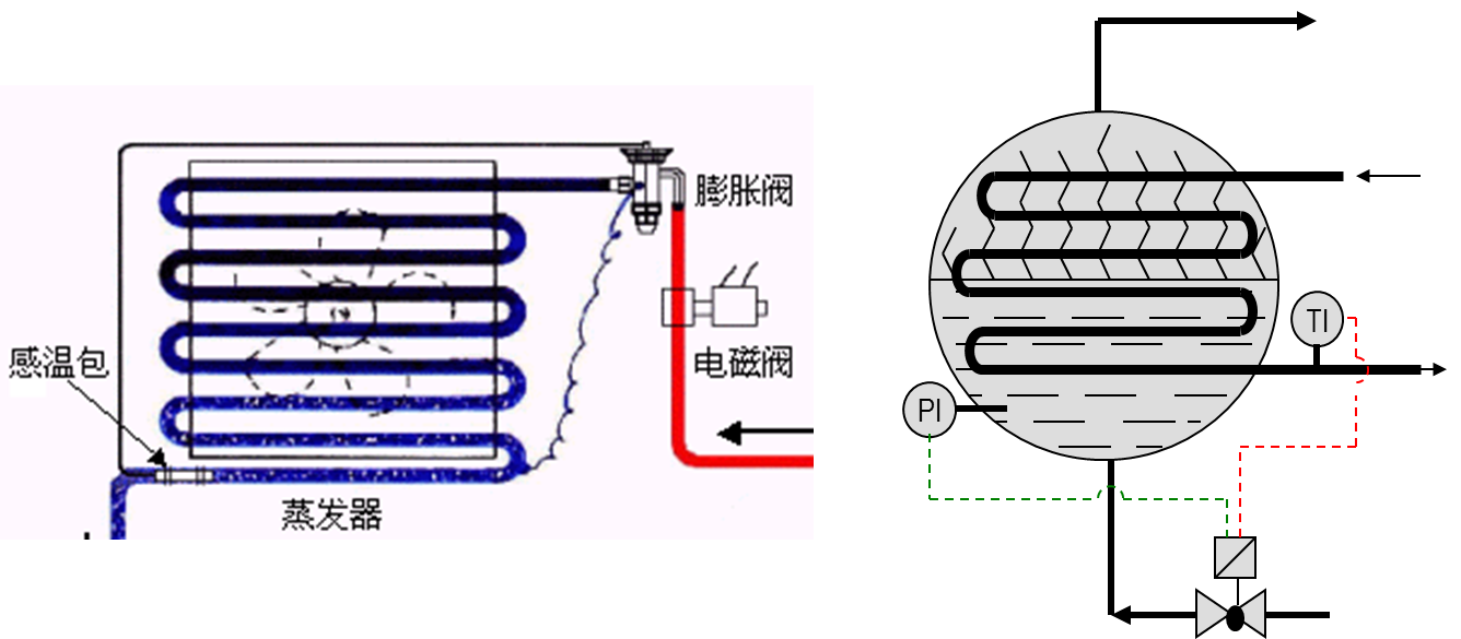 蒸发过程:通过节流阀截流后的低压液体,在蒸发器中从周围介质吸热制冷在蒸发过程中,制冷剂的温度和压力保持不变。