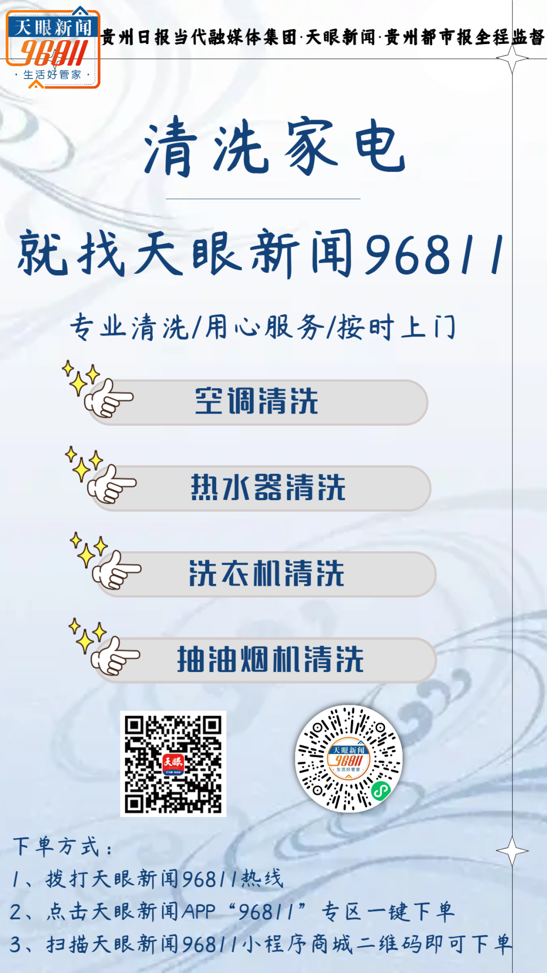 综上所述,如果你也想给家中的这些家用电器做清洁,欢迎拨打天眼新闻96811热线或点击天眼新闻APP96811专区一键下单,便能第一时间获得专业维修人员上门服务,服务全程有权威主流媒体监督,售后更有可靠保障。