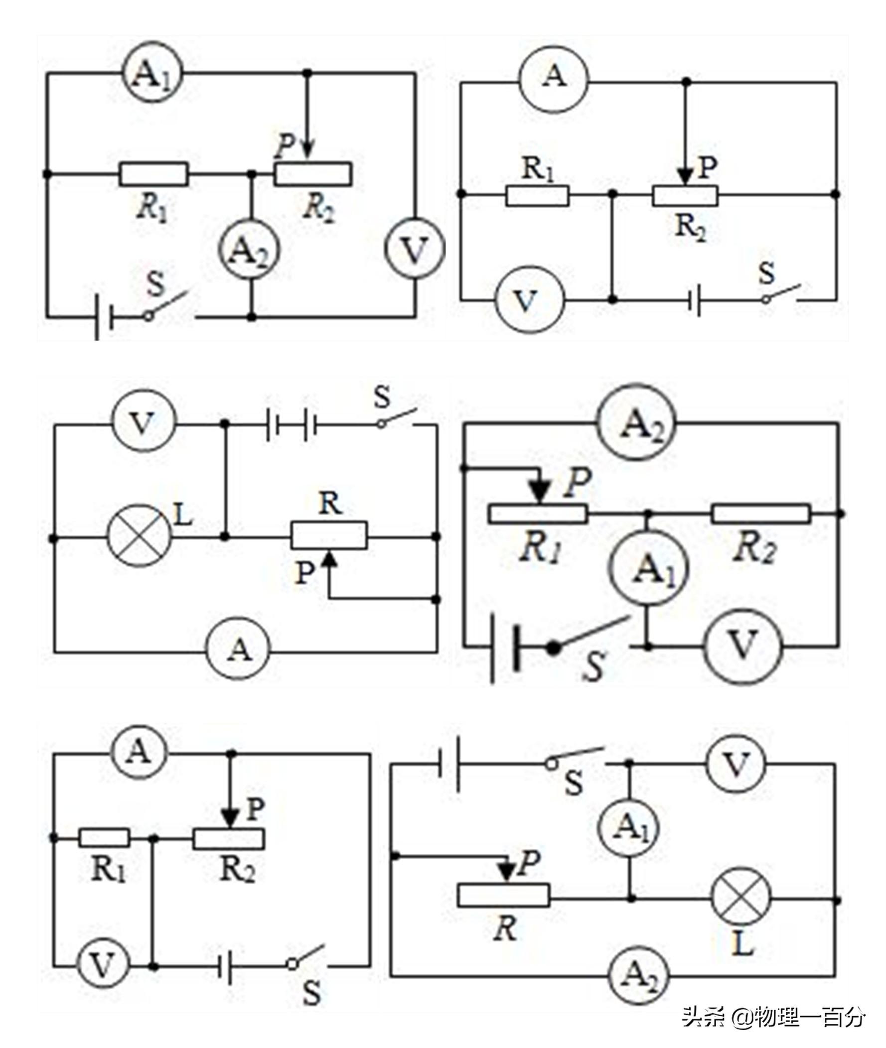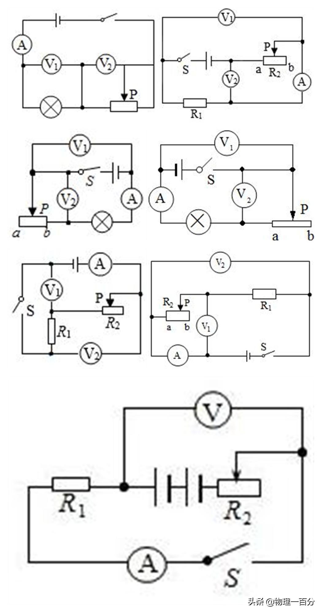 如上面这七个图,全部都是历年中考物理题中的插图,我们根本不需要看原题,只需要看这些图,就能想得出来所要考查的知识,因为,关于此类题,我们只要把串联的电路全部放在一起,就能在最短时间内归纳出此类题做法,从而做到彻底避免犯错!