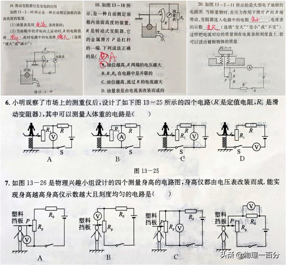 4.另外,有一种极其常考,且和生活应用相关的题型:利用与滑动变阻器相并联或者串联的电压表、电流表做成的“油量表、电子地磅、侧重仪、身高仪、测风仪……”其实都是滑动板变阻器的阻值变化引起电表变化的典型应用。
