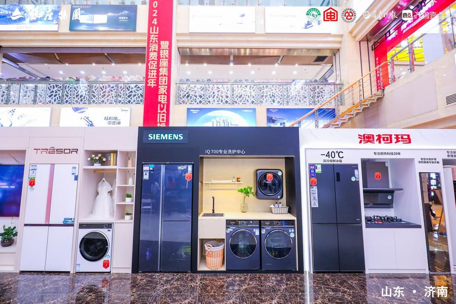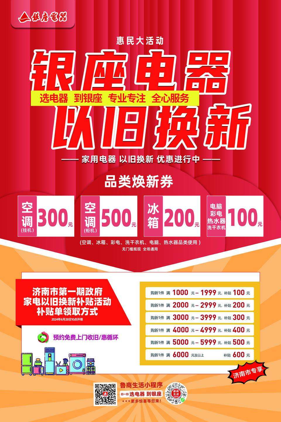 为推动相关政策落地生效,山东本土家电卖场银座电器积极行动,银座电器商城店作为济南城中心的大型家电卖场,联合场内百余家知名家电品牌,涵盖空调、彩电、冰洗、厨卫、小家电等几大品类,结合家电以旧换新相关政策推出“绮焕新生 臻享生活,绿色家电嘉年华”活动,辐射济南及周边地区,千款爆品直击低价并有超值补贴,满足消费者多场景、多品类的家电换新需求。