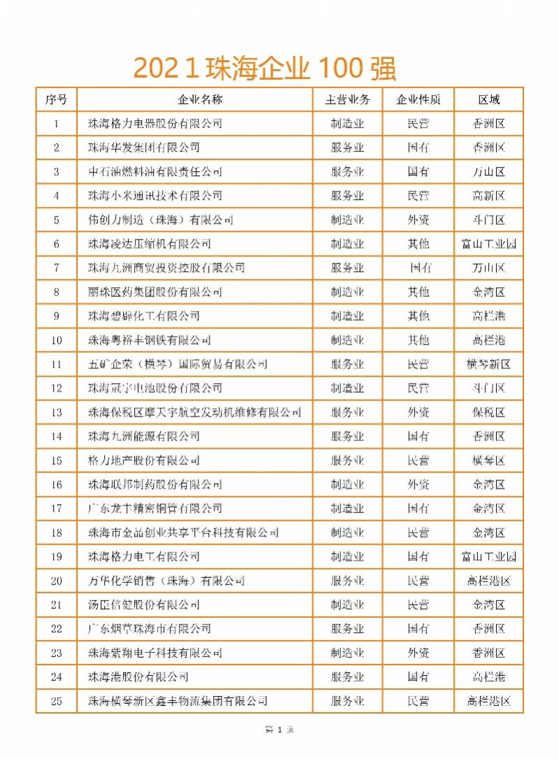 近日,珠海市企业与企业家联合会发布了2021珠海企业100强榜单,珠海格力电器股份有限公司排名第一,珠海华发集团有限公司紧随其后。小米、伟创力、凌达、丽珠医药等知名企业也榜上有名。