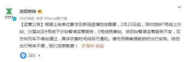 据深圳地铁官方微博22日晚消息,根据上级单位要求及新冠疫情防控需要,2月23日起,深圳地铁7号线上沙站、沙尾站及9号线下沙站暂停运营服务,5号线杨美站、坂田站暂停运营服务不变,双方向列车不停站通过,具体恢复时间待另行通知。