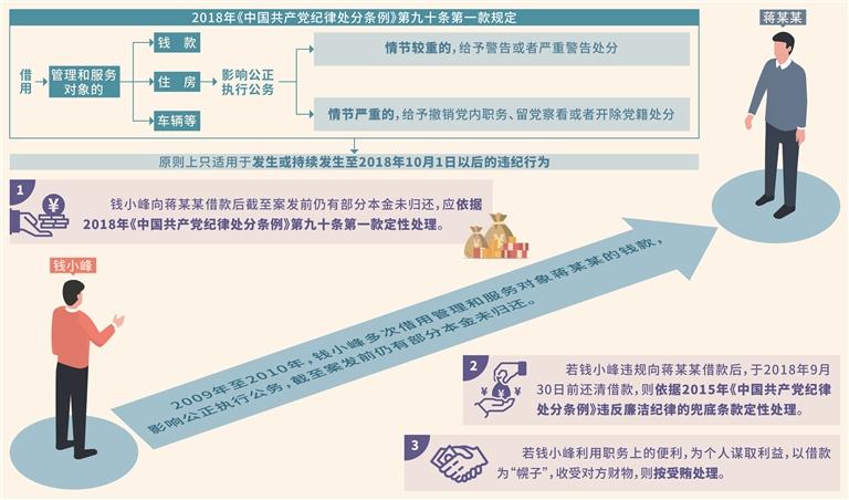 莫清:首先,2018年《中国共产党纪律处分条例》第九十条第一款是修订时新增的条文,原则上只适用于发生或持续发生至2018年10月1日以后的违纪行为。考虑到借用行为的延续性,借款期间出借人对党员干部公正执行公务的影响持续存在,应结合还款情况判断该类违纪行为的终止时间。具体而言,党员干部违规借款后已经归还的,以归还时间作为违纪行为的终止时间;至案发时仍未归还的,以立案时间作为终止时间。本案中,虽然钱小峰向蒋某某借款时间发生在2009年至2010年,但截至2021年案发前仍有部分本金未归还,故对其违纪行为应适用2018年《中国共产党纪律处分条例》第九十条第一款予以认定。