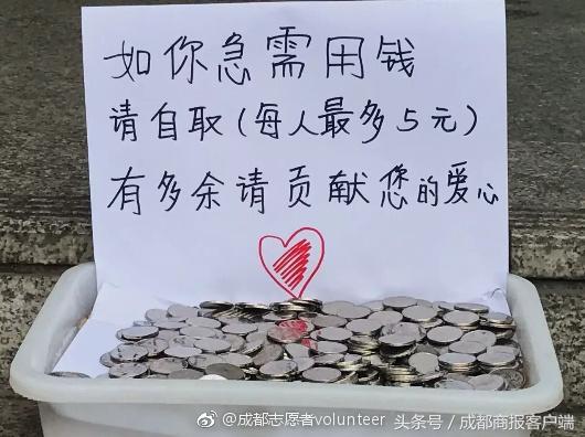31日17:43分,微博网友@_____________污妖王 在个人微博发布一张图片,并称“太有爱了,天府三街地铁口摆放的。”图片中是一个零钱盒,里面放满了硬币,一张白纸上手写着一段话:“如你急需用钱,请自取(每人最多5元),有多余,请贡献您的爱心。”随后,这张图片被@直播成都@最in成都等本地微博大V转发,很快评论、点赞数过千。