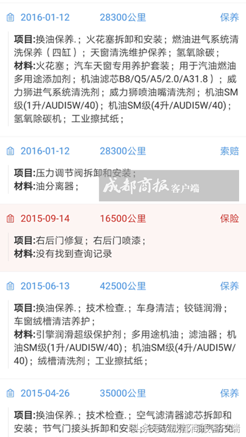 ▲ 在保养记录里面,显示该车在2015年6月保养里程4.25万公里,9月保养里程却变成了1.65万