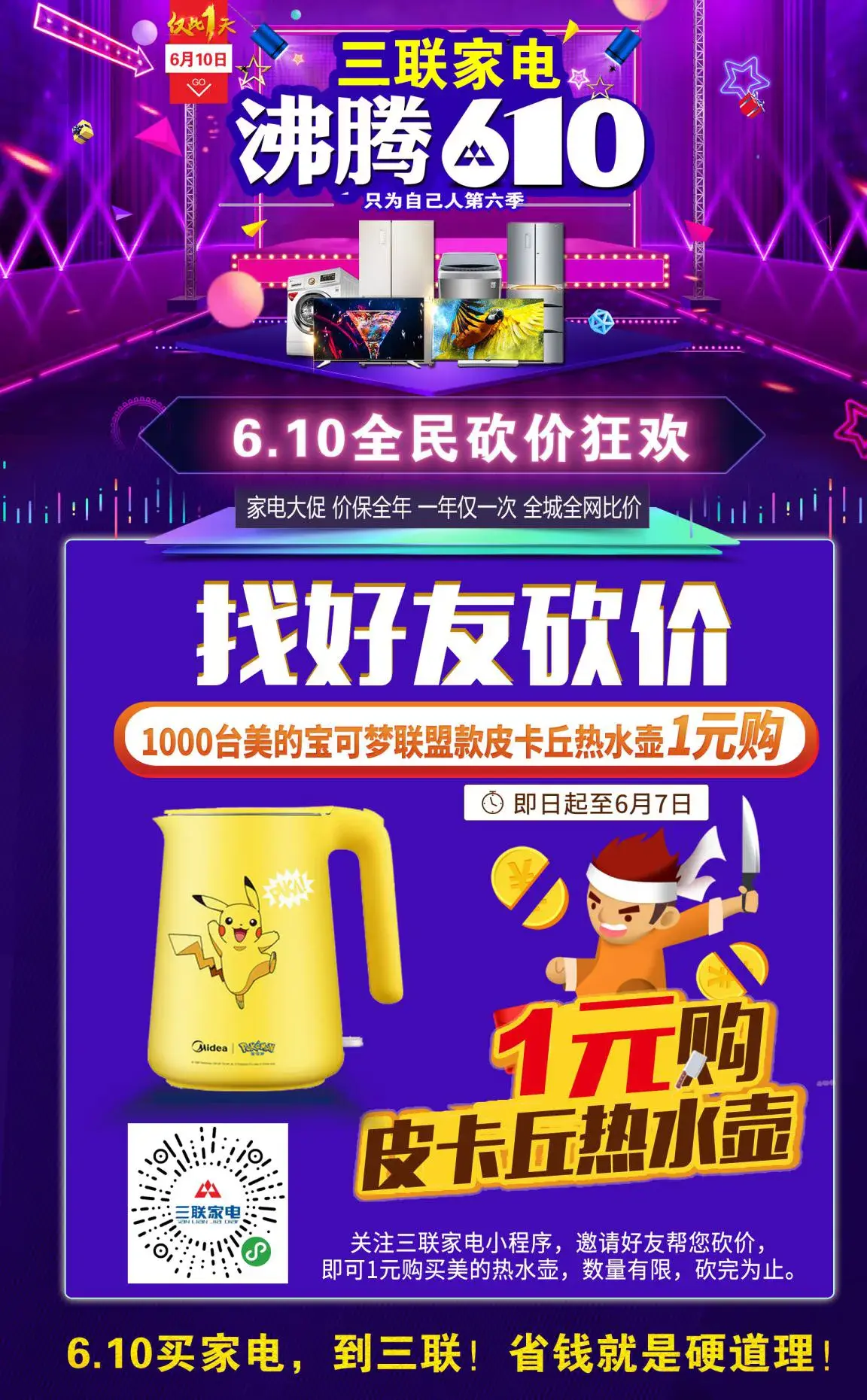 5、1元购美的宝可梦联盟款皮卡丘热水壶,足足有1000台等着大家来砍价!马上打开微信小程序,搜索“潍坊三联微商城”参与吧!找你的朋友为你砍价,1元购!1元购!