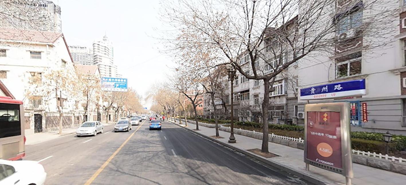 位于市南区的这条贵州路,大部分路段是四车道。路中有一所青岛商务学校,附近还有一些居民区,所以平时人流量比较大。但是,道路两旁路树成荫,很漂亮,一点也不觉得拥堵杂乱。