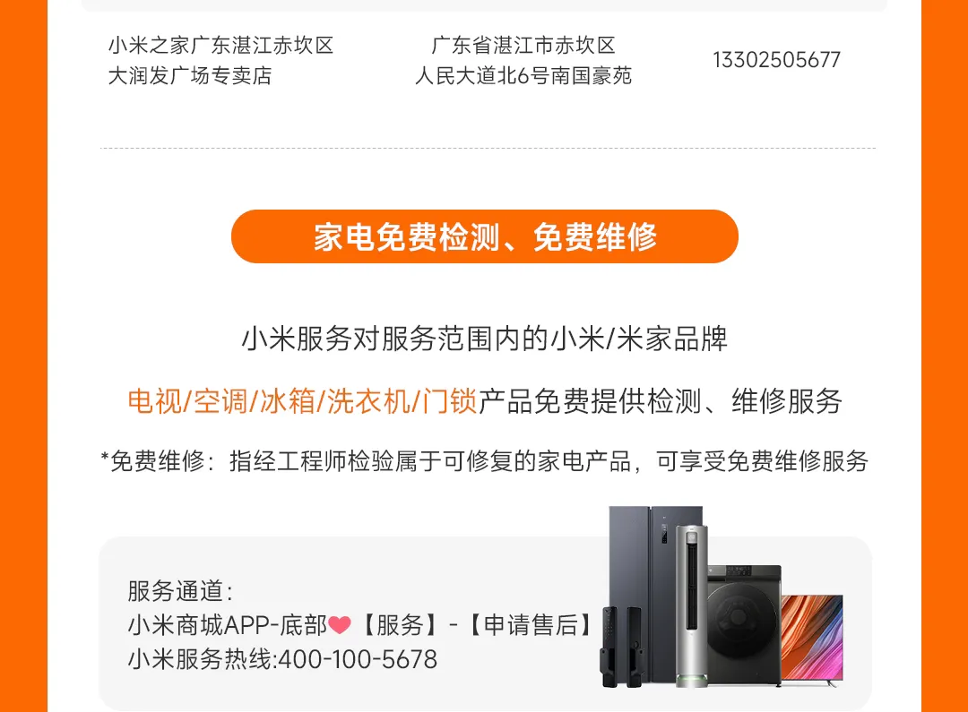 对服务范围内的小米 / 米家品牌电视 / 空调 / 冰箱 / 洗衣机 / 门锁产品免费提供检测、维修服务,经工程师检验属于可修复的家电产品,可享受免费维修服务。