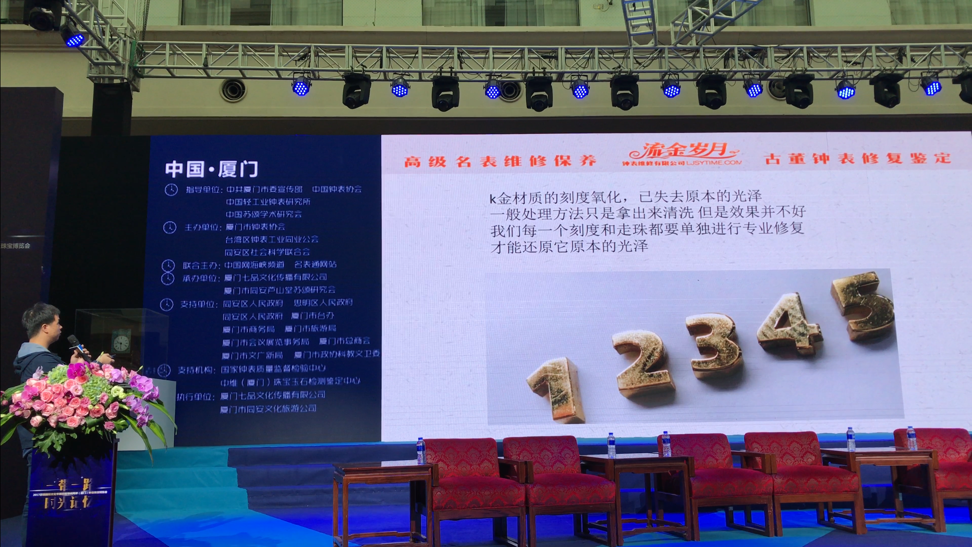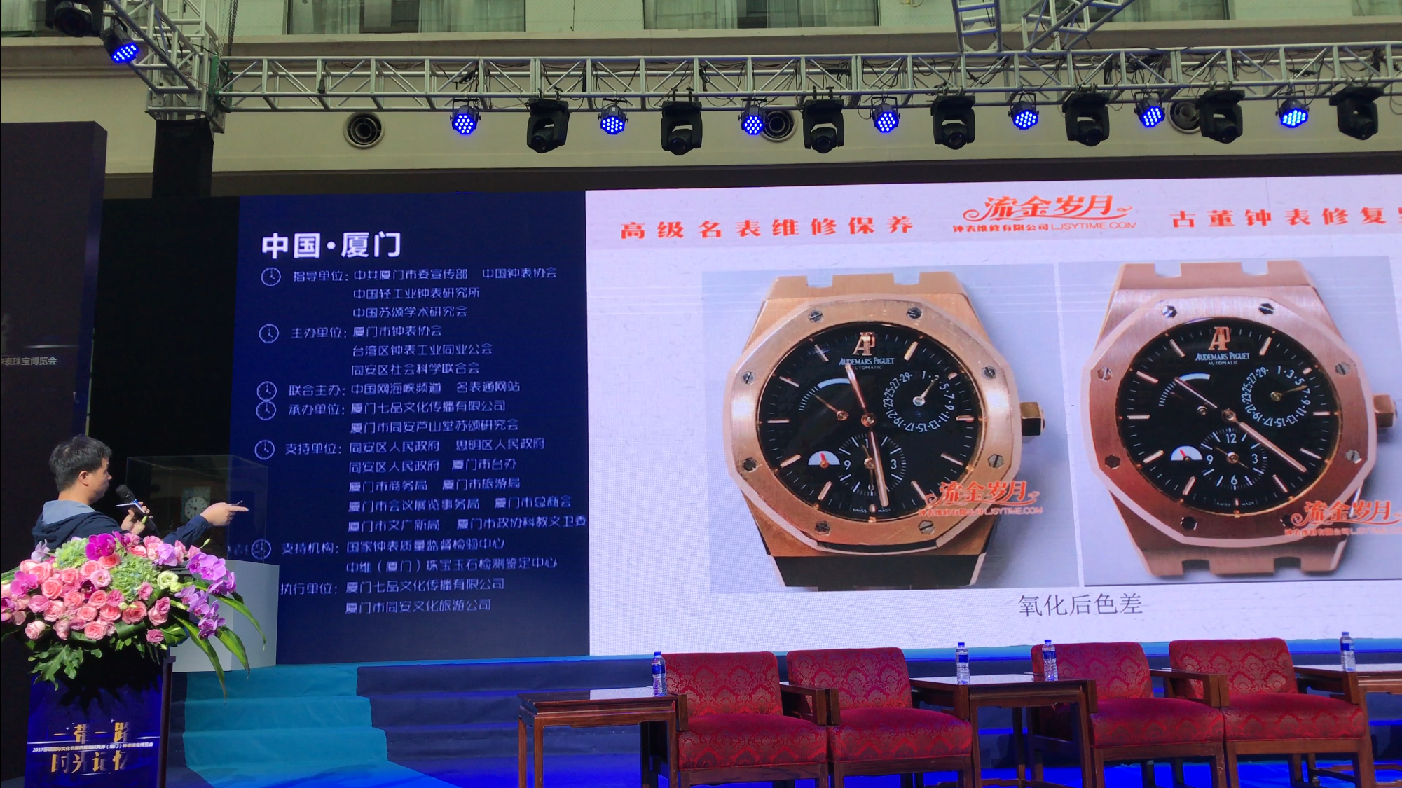 广州市流金岁月钟表维修有限公司,同时也是第二届海峡两岸钟表维修技师交流会协办单位,在交流会上为现场嘉宾和观众分享了本公司名贵钟表的美容修复案例:爱彼皇家橡树美容修复保养案例、萧邦快乐钻石美容修复保养案例 等等。