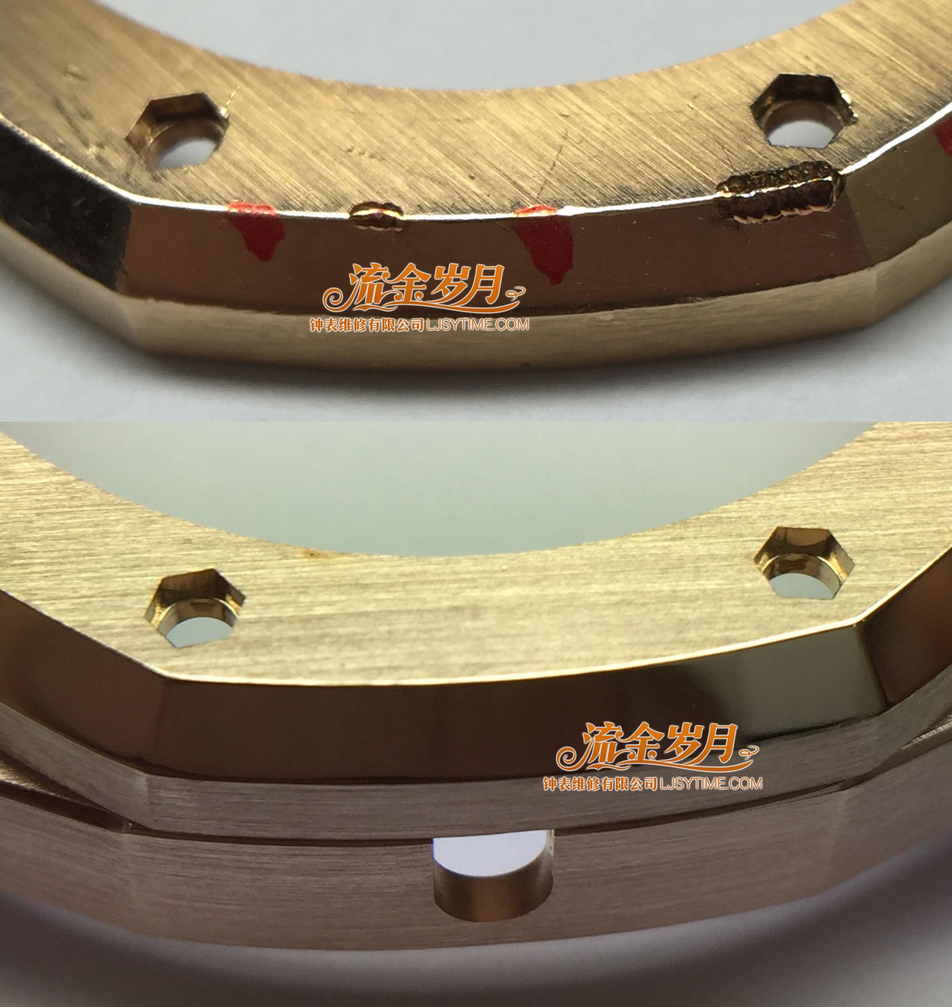美容修复前表圈的样子,和经过补金、手工拉丝等修复处理后的效果对比。处理后表圈线条清晰立体、光面平整。