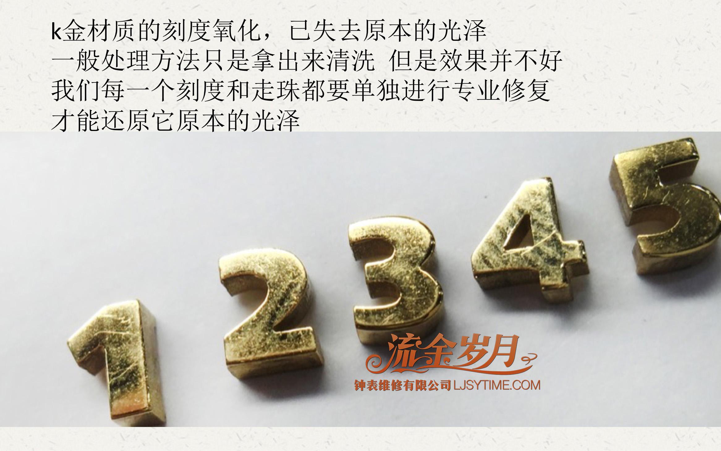k金材质的刻度氧化,已失去原本的光泽,一般处理方法只是拿出来清洗,但是效果并不好,我们每一个刻度和走珠都要单独进行专业修复,才能还原它原本的光泽。