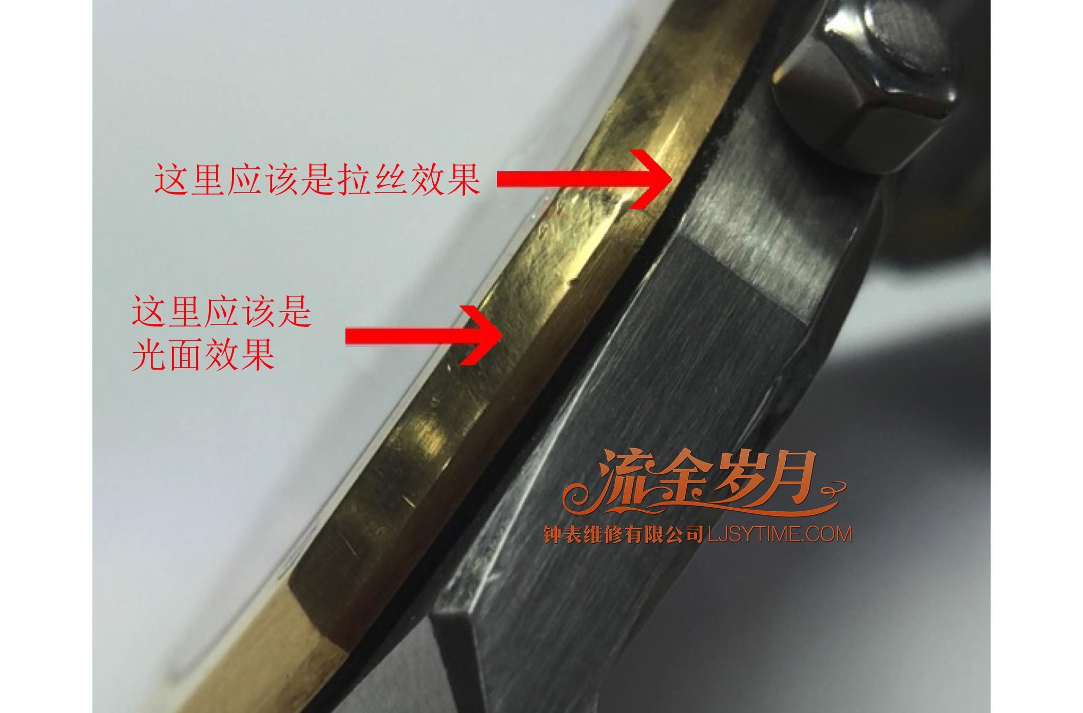 如图箭头所示:这只被过度处理的表壳,曾经被处理成非原厂的效果,而且手法粗糙。(表圈原本应该是拉丝效果和光面效果)。
