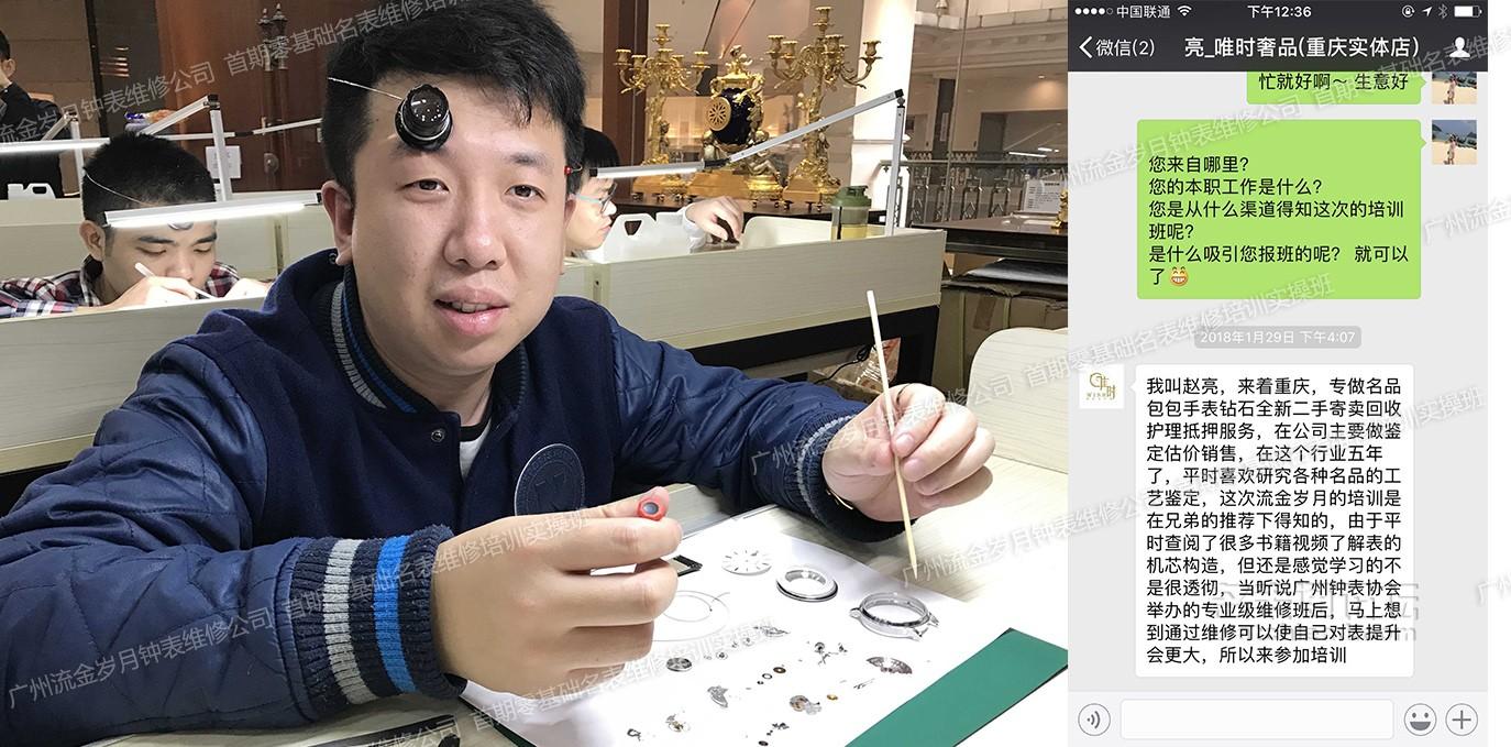 专做名品包包手表钻石全新二手寄卖回收护理抵押服务,在公司主要做鉴定估价销售,在这个行业五年了,平时喜欢研究各种名品的工艺鉴定,这次流金岁月的培训是在兄弟的推荐下得知的,由于平时查阅了很多书籍视频了解表的机芯构造,但还是感觉学习的不是很透彻,当听说广州钟表协会举办的专业级维修班后,马上想到通过维修可以使自己对表提升会更大,所以来参加培训