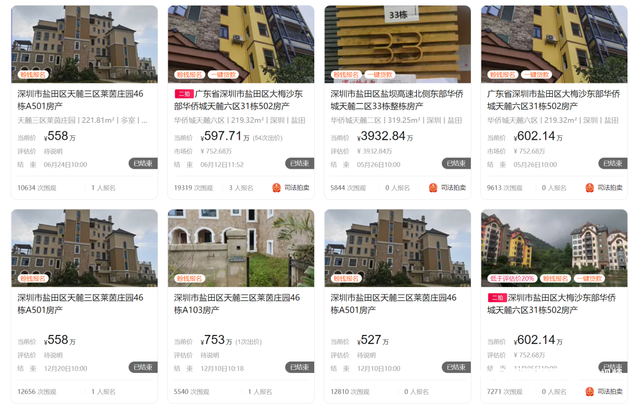 而这并不是天麓遭遇的第一次法拍,在过去的几年里,华侨城天麓的法拍信息只增不减。在阿里法拍搜索“天麓”的关键词,出现在广东深圳地区的拍卖标的共有80个,而排在首页拍卖的8套房源中仅两套有出价,其余6套均流拍。