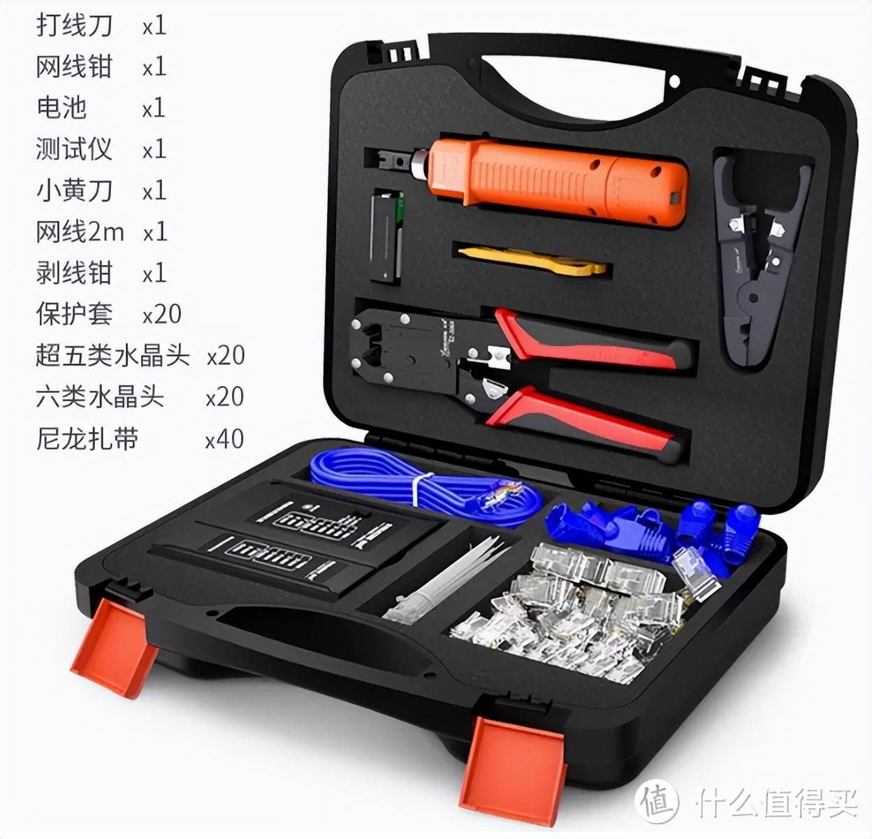 额外1:网线测试与接头安装。这个随便买个网线安装套装就行了,一两百块一套,网线钳、测试仪、打线刀(用来安装面板里的网络插座端子)什么的都有了。