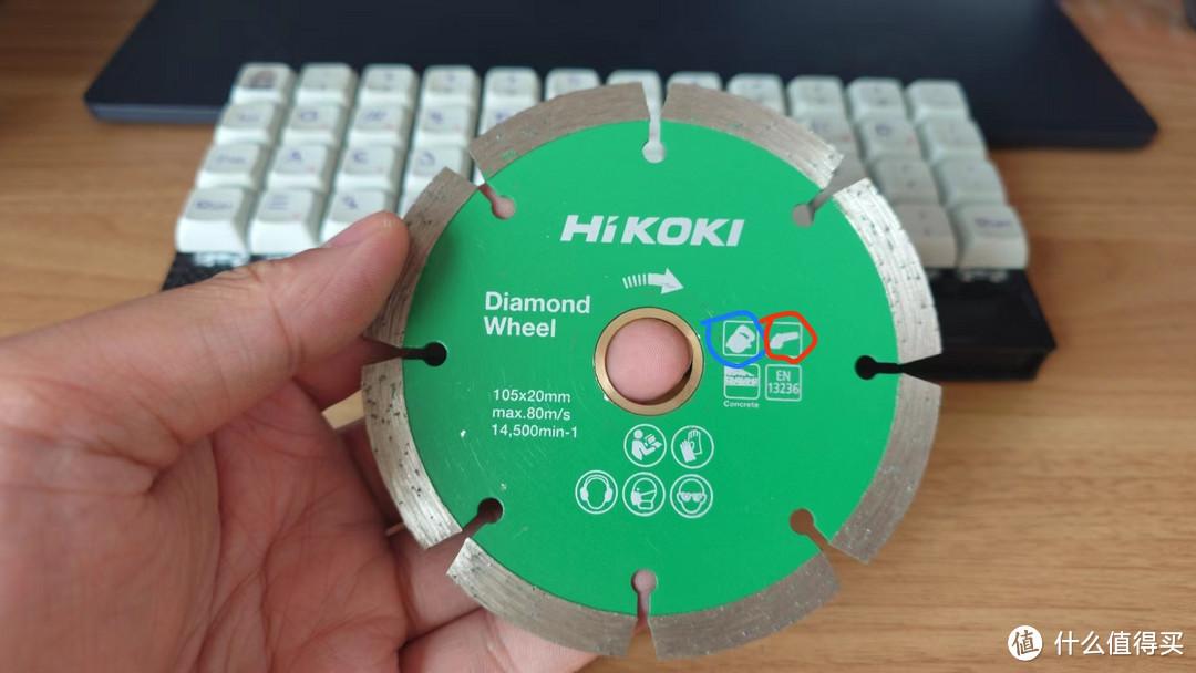 蓝圈里的图标表示可以在手提切割机上使用,红圈里的图标表示可以在角磨机上使用。