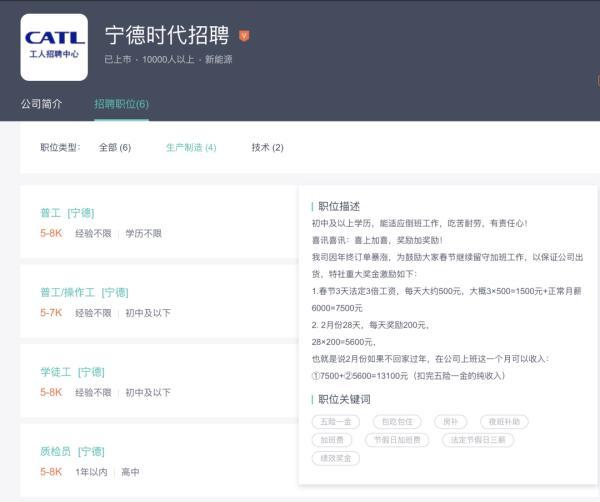 近日,在某招聘网宁德时代工人招聘中心发布多条与生产制造相关的岗位招聘信息。部分职位描述称,因年终订单暴涨,为鼓励大家春节继续留守加班工作,以保证公司出货,特设重大奖金激励。