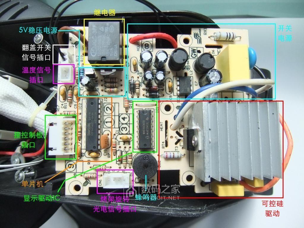 卸下主电路板固定螺丝,取下主电路板,主电路板上元件功能区分布: