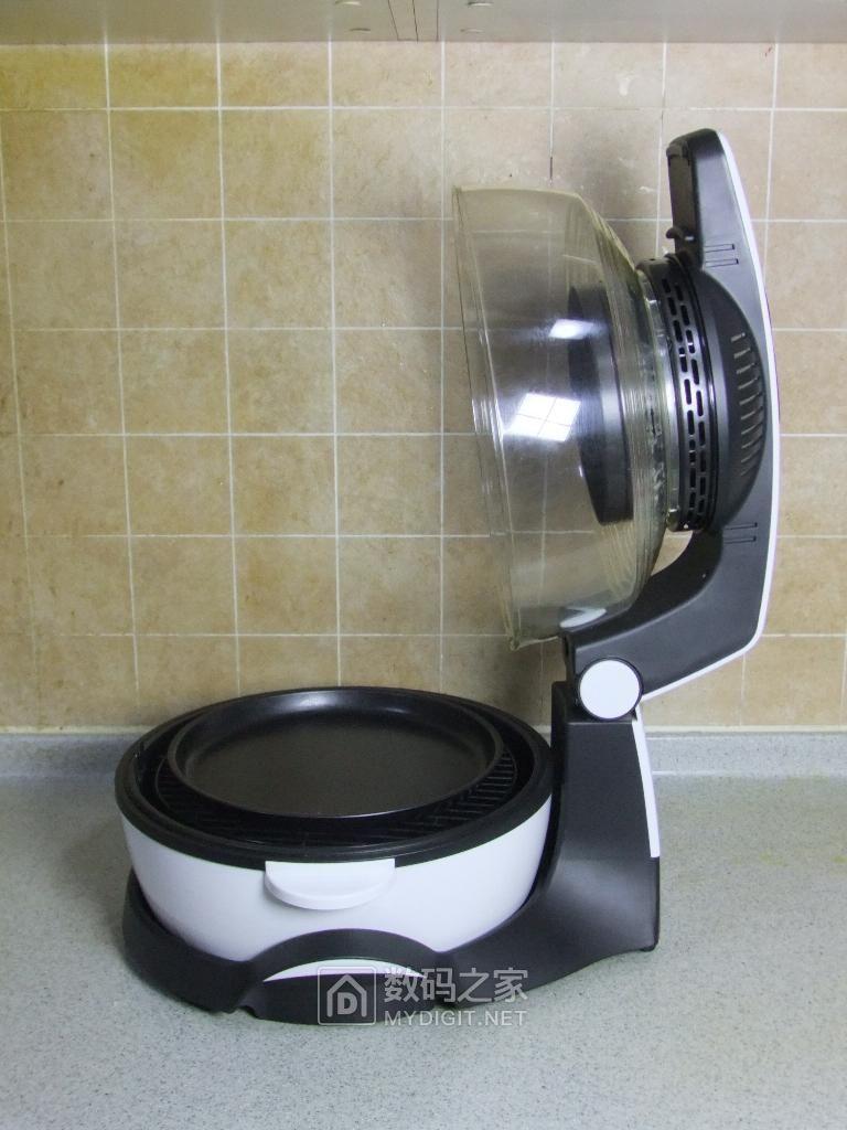 将翻盖提手向上拉,打开透明外罩,可以放入食物烘烤: