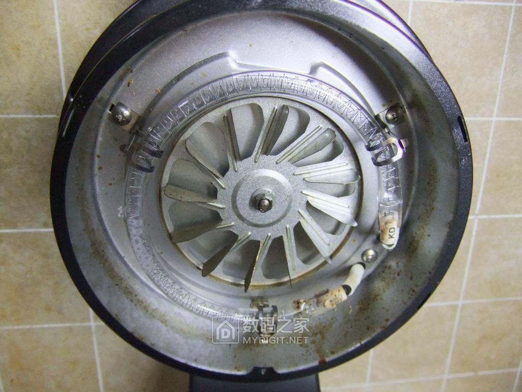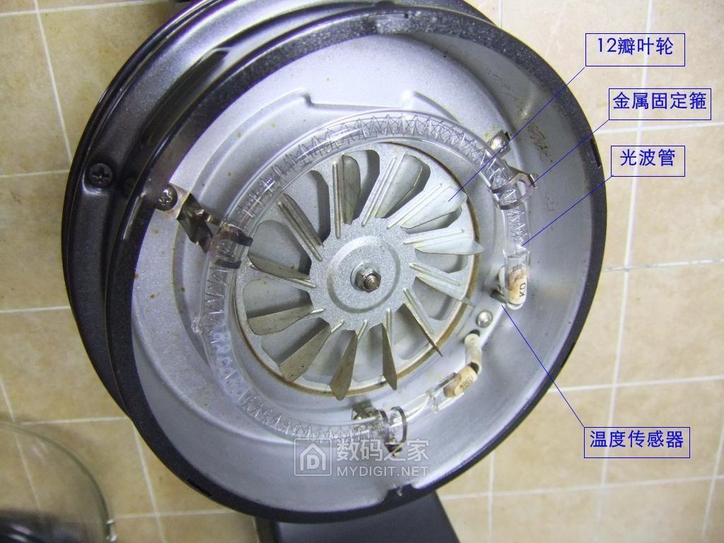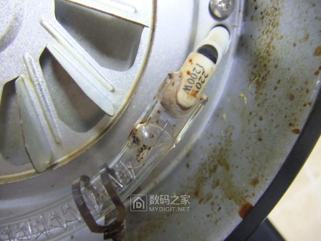 内部是环形光波加热管及金属风扇叶轮。由于这种炸锅是密闭类型,油烟在内壁及灯管上有一定沉积: