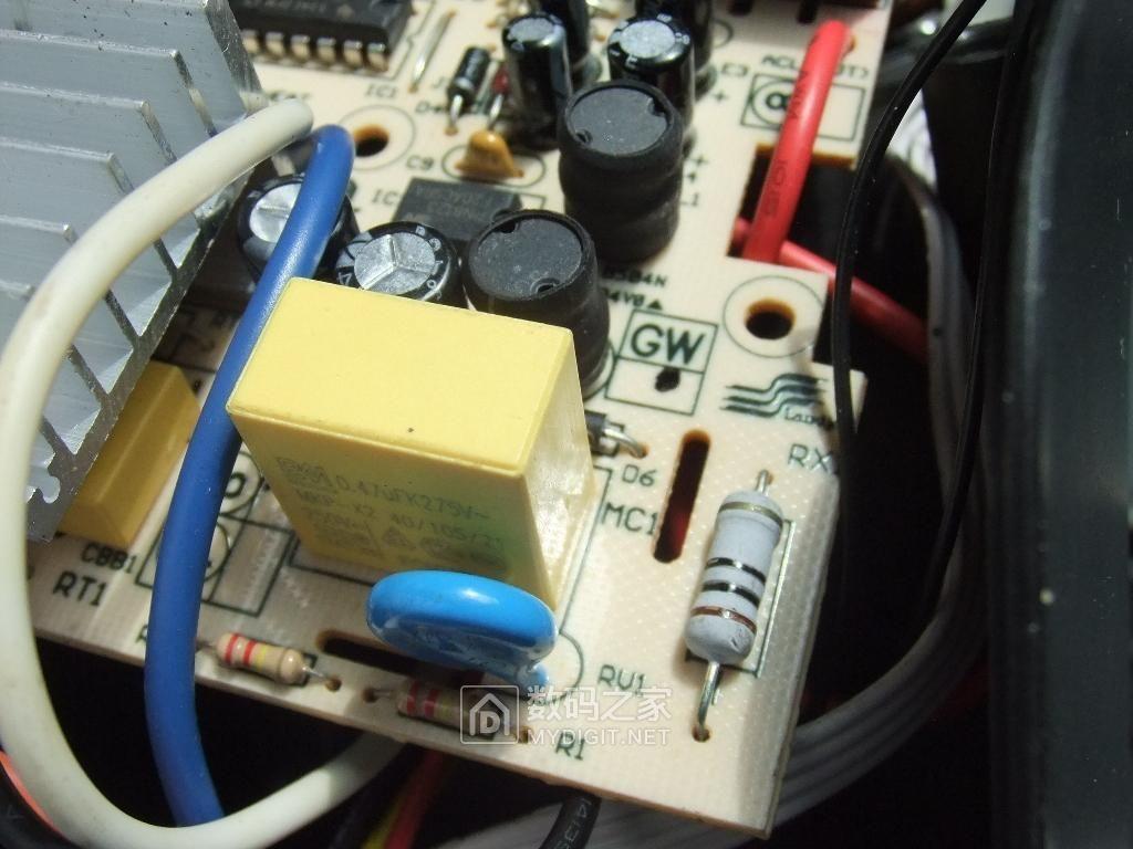 电路板上,RX1是10Ω 2W保险电阻,蓝色圆片RV1是压敏电阻,黄色MC1是安规电容: