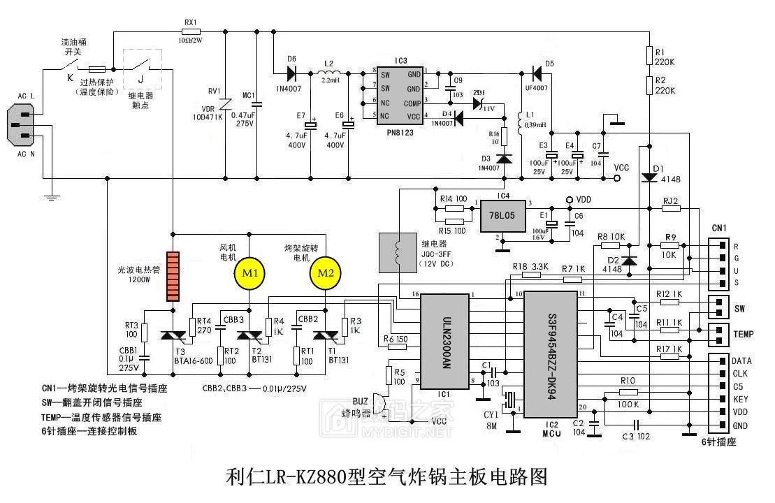 根据电路板,绘出该空气炸锅的电路原理框图如下: