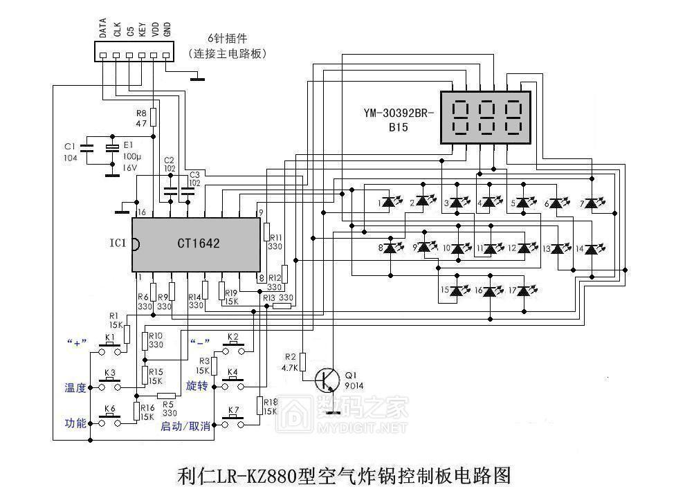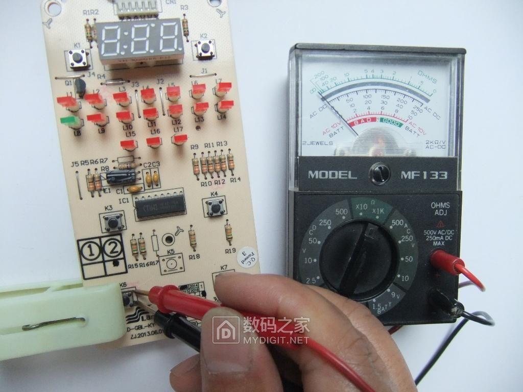 在控制电路板上,“功能”键的微动编号是K6。用万用表电阻档检测,按下,不通,有问题!其余微动没有问题: