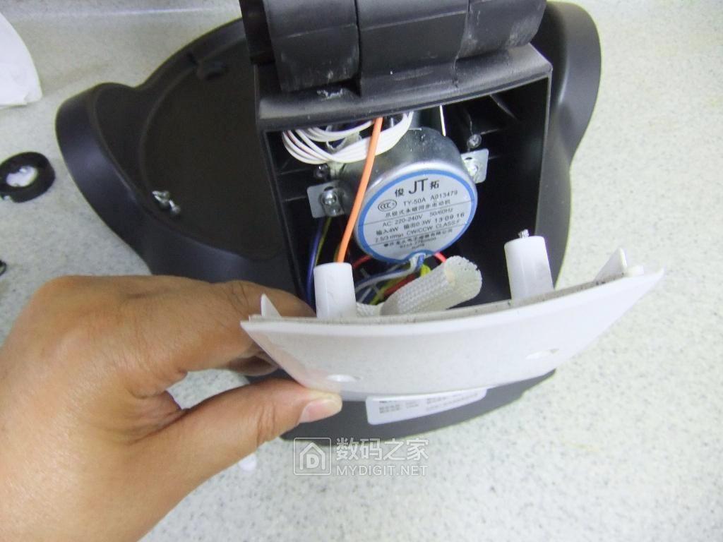 拆下底座盖板4颗固定螺丝,看见内部有一只微动开关,这只微动开关是检测不粘锅盘(滴油桶)放置位置用的