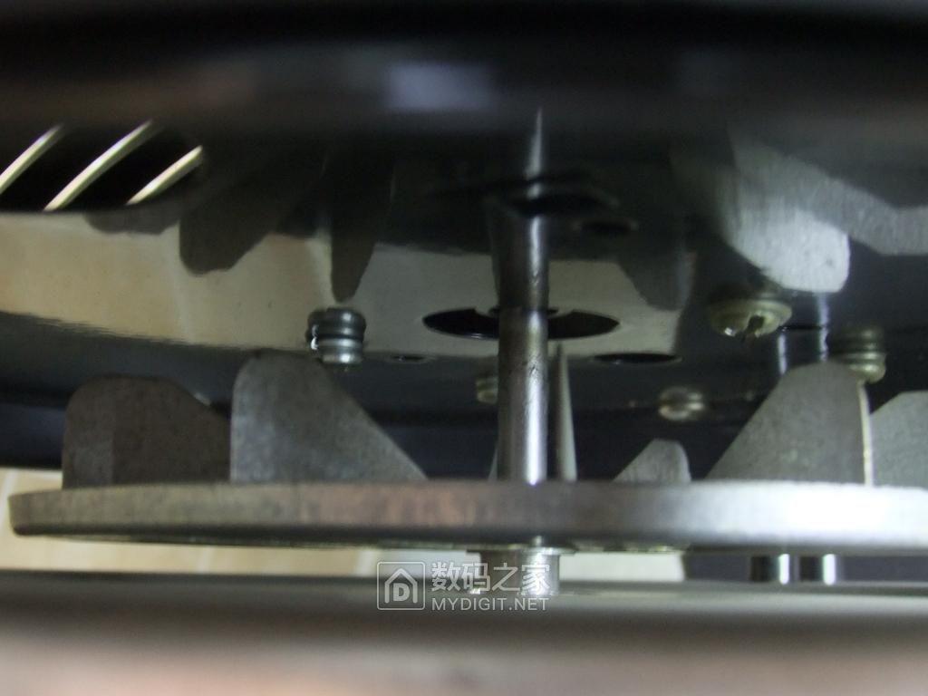 从这个角度看,隔热空间内安装有同轴风扇叶轮,将热量吹出,避免翻盖提手发烫,同时对翻盖提手内的电路板也起到气流散热作用: