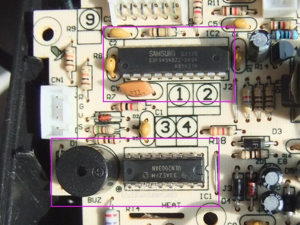IC2是家电常用的单片机,型号S3F9454BZZ-DK94,下边黄色元件CY1是三脚8MHz陶瓷滤波器;IC1是大电流驱动阵列集成电路ULN2003AN,多用于单片机、智能仪表、PLC、数字量输出卡等控制电路中,输出可达500mA/50V,可直接驱动继电器等负载,旁边黑色圆柱体BUZ是蜂鸣器。