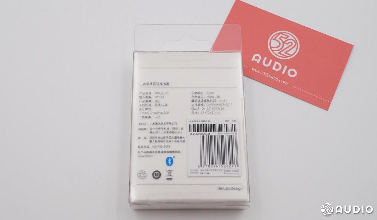 包装盒背面罗列了详细规格。品名:小米蓝牙音频接收器;产品型号:YPJSQ01JY;输入参数:5V 1A;充电时间:2小时;充电端口:Micro USB;最长连续播放时间:4小时;产品重量:30g;无线连接:蓝牙4.2版;支持协议:HFP(免提规格)、HSP(手机规格)、A2DP(蓝牙音频传输模型协定)、AVRCP(音频/视频远程控制配置文件);工作距离:10m;尺寸:97*70*21mm。