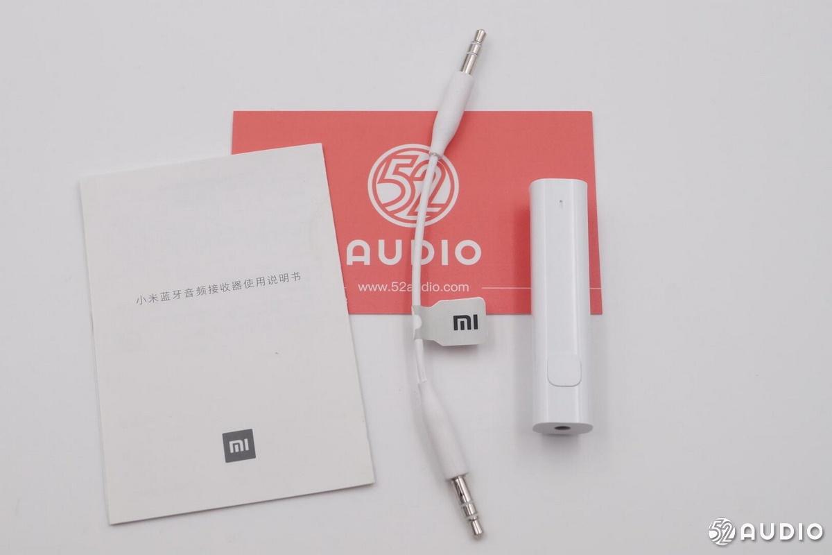 包装盒内所有物品,有一根3.5mm AUX线、小米蓝牙音频接收器本体和一份说明书。
