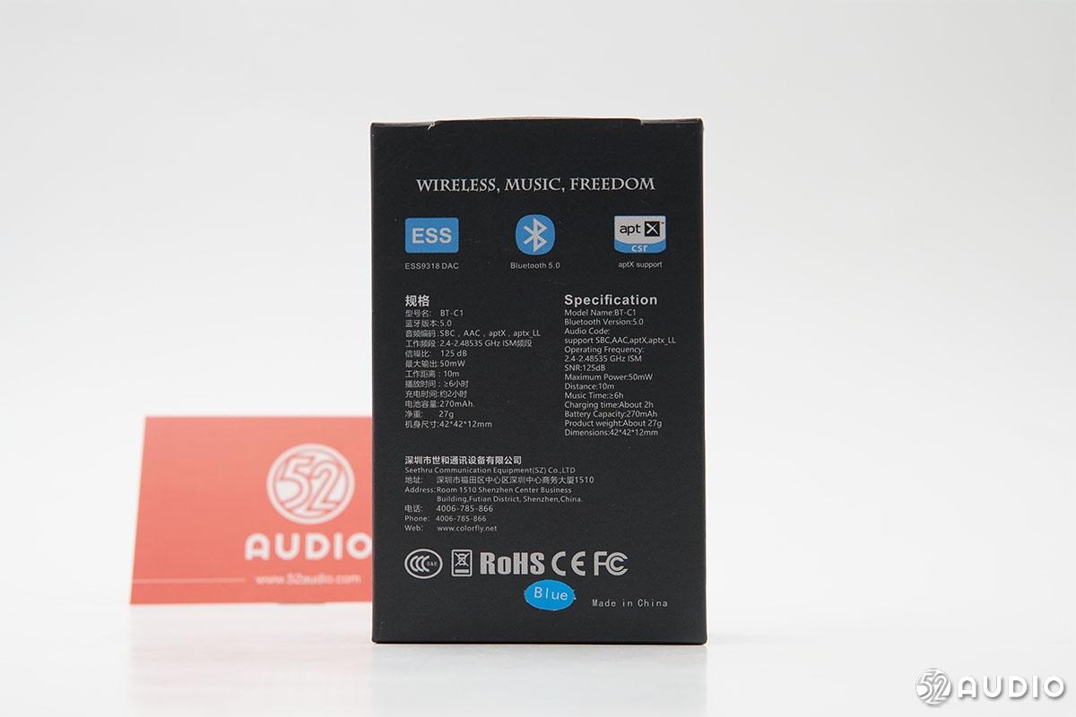 从包装背面看到,七彩虹Colorfly BT-C1采用了ESS ES9318 DAC,这款是vivo X9s plus的同款DAC,ESS ES9318采用集成运放的设计,可以有效节省PCB空间和降低功耗和发热。采用了高通CSR8670,支持蓝牙5.0。在音频传输技术上,支持aptX,aptX_LL(aptX Low Latency),aptX可以让蓝牙无线音频达到CD级别的听感,aptX Low Latency是低延迟的蓝牙连接协议,适合玩游戏和其它实时操作。