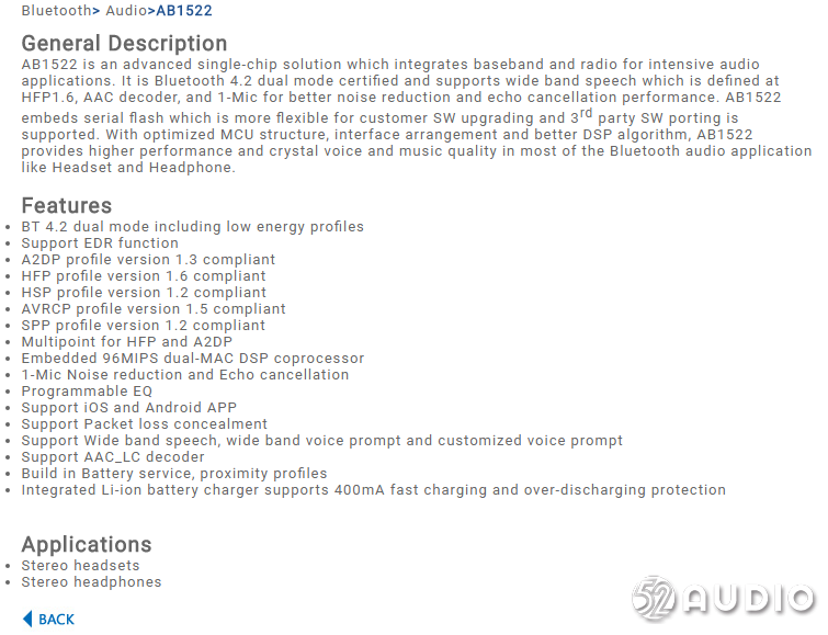 据我爱音频网拆解分析,SONY SBH24蓝牙接收器采用AIROHA络达方案,图为 AB1522S 蓝牙立体声耳机单芯片。