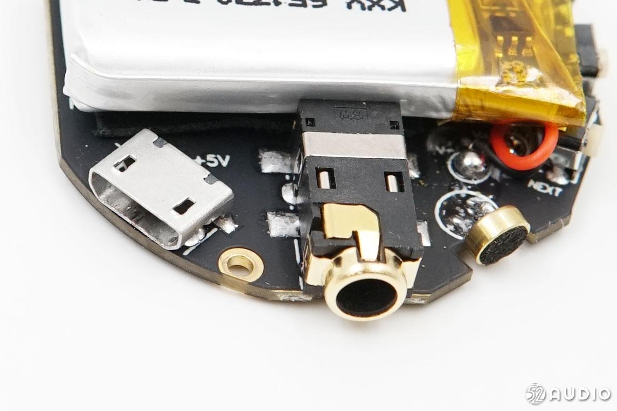主要扩展元件被焊接在这一边,从左往右分别是:Micro USB插座、3.5mm镀金插座和电容式麦克风。