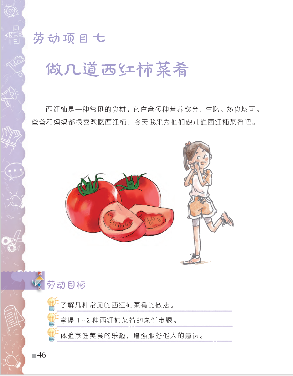 第三学段(5~6年级) ,做2~3道家常菜,如西红柿炒鸡蛋、煎鸡蛋、炖骨头汤等,还要会设计一顿营养食谱;