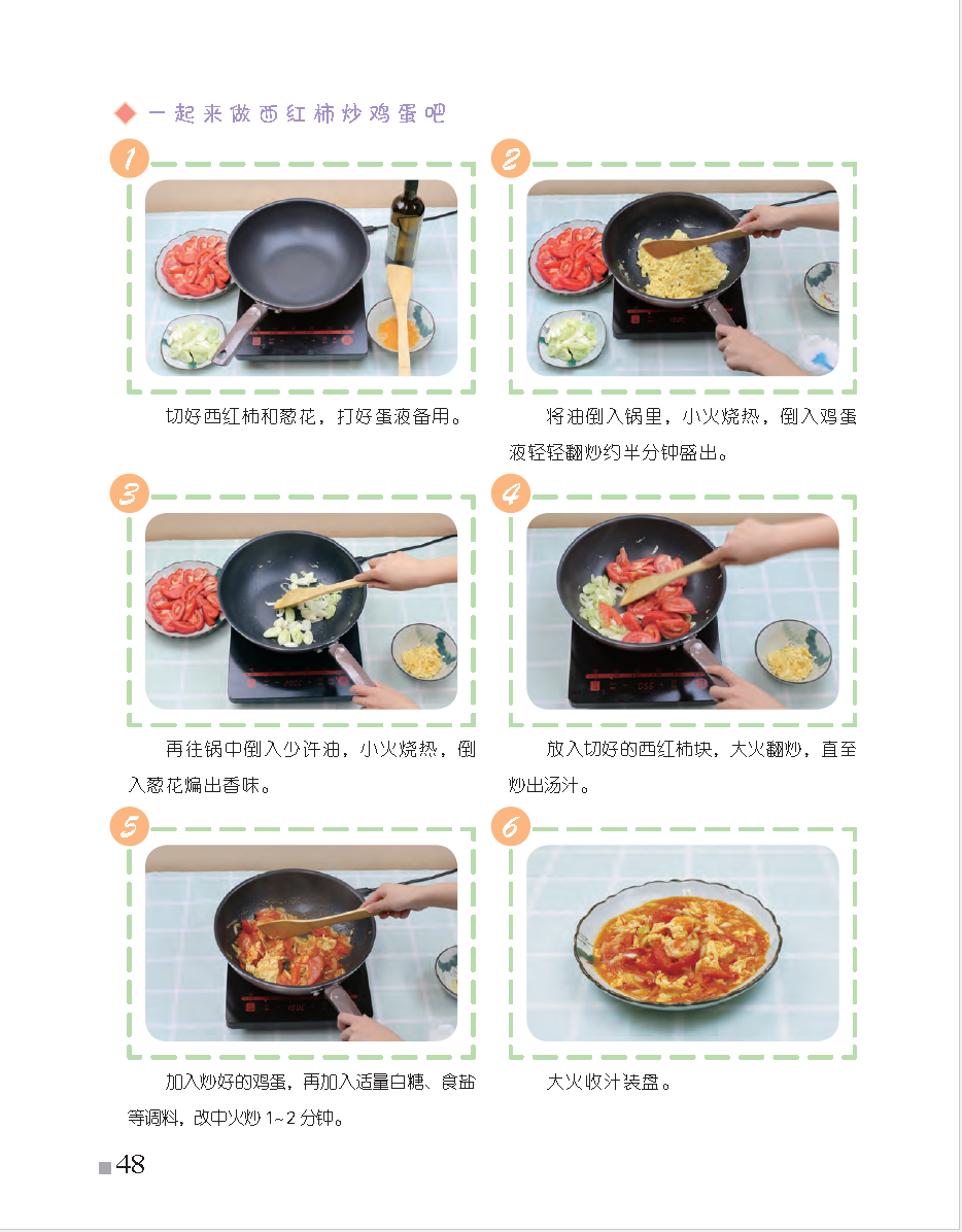 就说大家讨论最热烈的“西红柿炒鸡蛋”这道菜吧,我们的教材里呈现得非常详细,而且不止是西红柿炒蛋,西红柿系菜肴都有哦 :