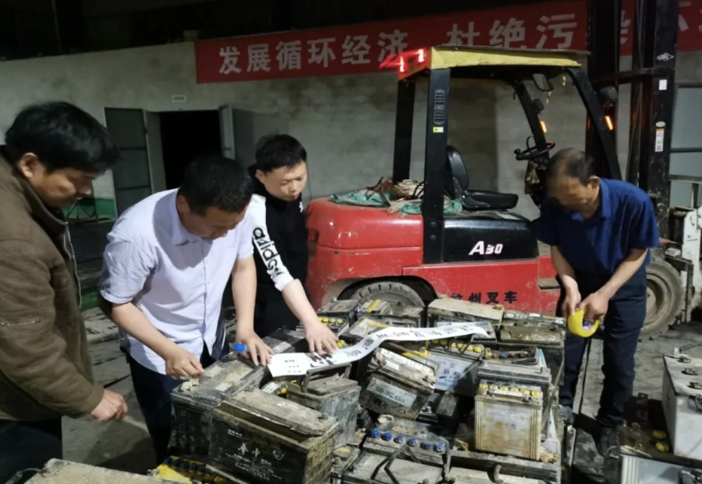 仙桃市生态环境局对非法收集贮存废旧铅酸电池商户实施查封扣押。图片来自仙桃市生态环境局