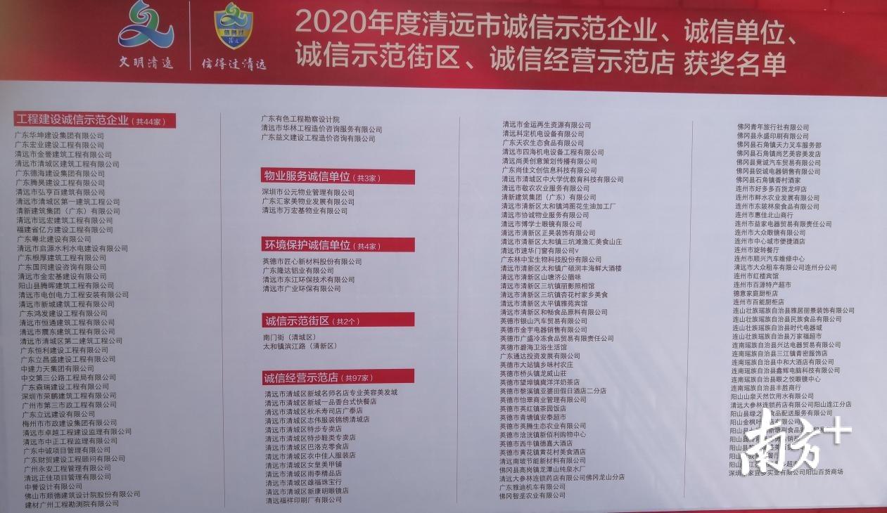 近日,2020年清远市诚信示范企业、诚信单位、诚信示范街区、诚信经营示范店表彰仪式在清城区举行。44个工程建设诚信示范企业、3个物业服务诚信单位,4个环境保护诚信单位、2个诚信示范街区、97个诚信经营示范店获集中表彰。