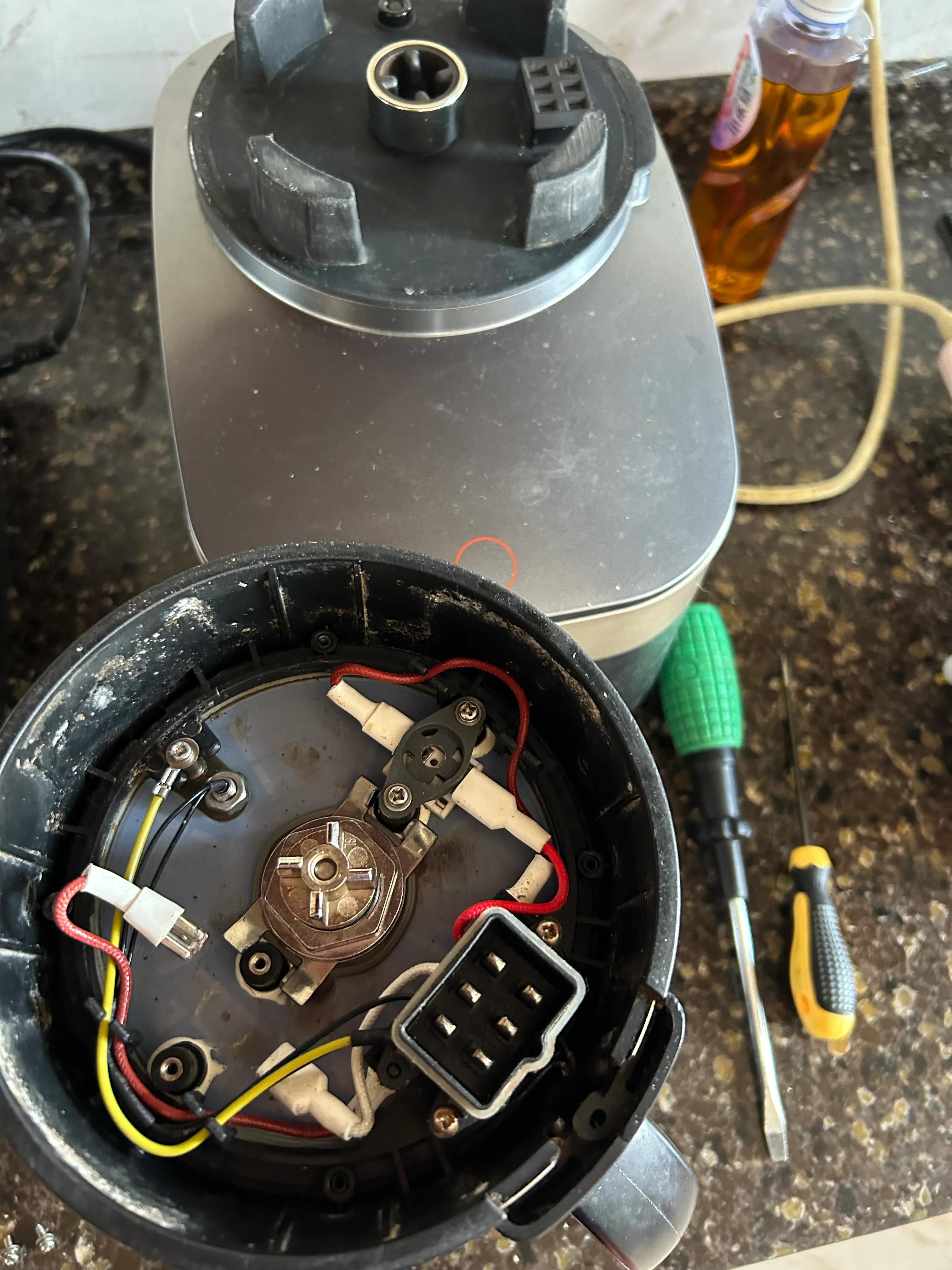 我把机器拿回了家,打开热杯的底座,卸下复位开关。仔细观察发现只是复位按钮生锈导致卡死。我用除锈喷剂反复喷淋除锈。不一会儿那个复位按钮就活动如常。重新安装上去一实验,机器马上就好了!