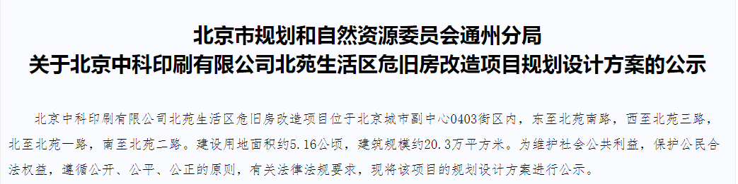 记者了解到,早在2017年2月28日,北京市规划委员会通州分局就已经发布了“北京市规划委员会通州分局关于办理北京中科印刷有限公司北苑生活区改造项目规划设计方案平面图有关情况的公示”; 2018年,更传出项目发布如下腾退补偿安置方案: