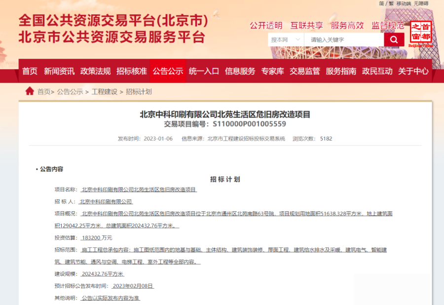 那么,这个改造项目有什么最新进展呢? 近日,全国公共资源交易平台(北京市)北京市公共资源交易服务平台发布招标计划:北京中科印刷有限公司北苑生活区危旧房改造项目位于北京城市副中心0403街区内,东至北苑南路,西至北苑三路,北至北苑一路,南至北苑二路。