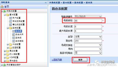 2、 在[基本配置]-> [路由配置]->[路由表]中增加所需的号码头,点[保存],如下图: