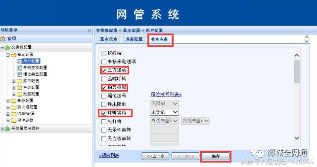 4、 在编辑选项中选择[补充业务],依次在[三方通话]、[拍叉权限]、[呼叫等待]三项功能前打“√”,最后点[保存]。