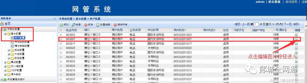 3、 在网管系统界面,依次点开左侧下拉菜单中的交换机配置基本配置用户配置,选择右侧区域中的号码,点击右侧图标进入该号的编辑界面。
