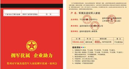 活动开展仪式上,15名监利市立功受奖和生活困难的退役军人成为首批受益对象,监利市退役军人事务局、TCL控股武汉商务中心现场为他们发放了纪念品和惠军专属卡。其他惠军专属卡,监利市退役军人事务局将依托各乡镇、村(社区)退役军人服务站进行发放。领取到惠军专属卡后,退役军人和其他优抚对象可凭卡到监利新华家电购买TCL电视、TCL空调、TCL冰箱、TCL厨卫等电器,可在优惠价基础上每台再享受400元“补贴”。