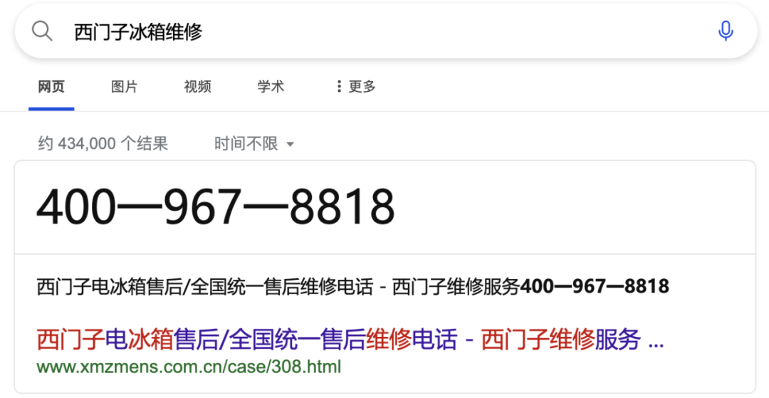 当家用电器出现故障,很多人往往选择在网上搜索拨打品牌的官方维修电话,但大量虚假的家电维修商家通过向互联网平台支付广告费,使得其维修广告信息出现在搜索结果最上面的第一位。